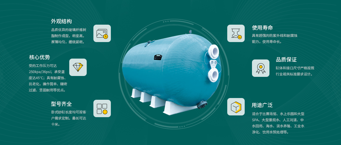 AQUA愛(ài)克泳池設(shè)備旗下的臥式過(guò)濾砂缸采用優(yōu)質(zhì)的玻璃纖維樹(shù)脂制作成型,密度高,厚薄均勻,纏繞緊密