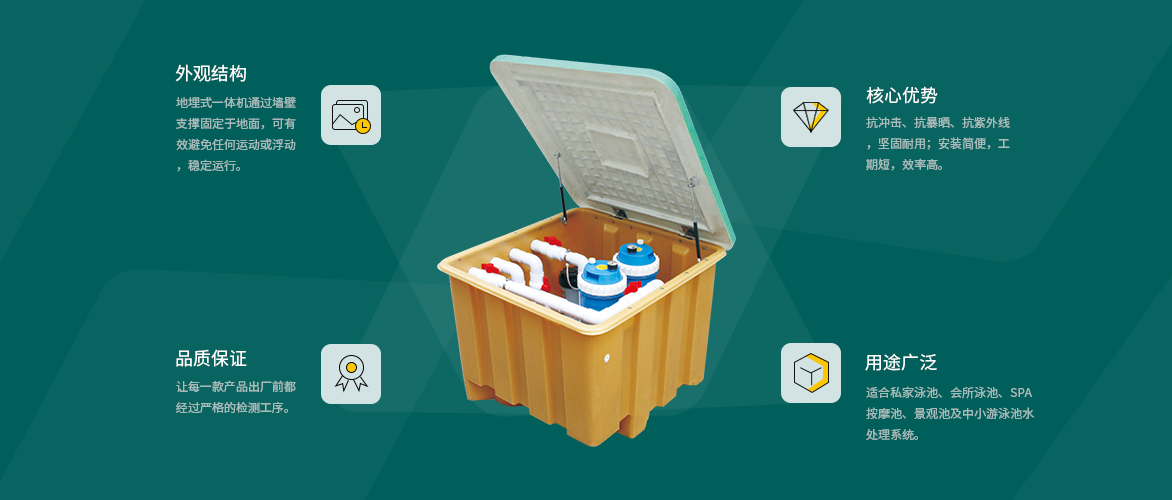 AQUA愛克泳池設備旗下的地埋式一體機殼體采用特殊材質,抗沖擊、抗暴曬、抗紫外線,堅固耐用。