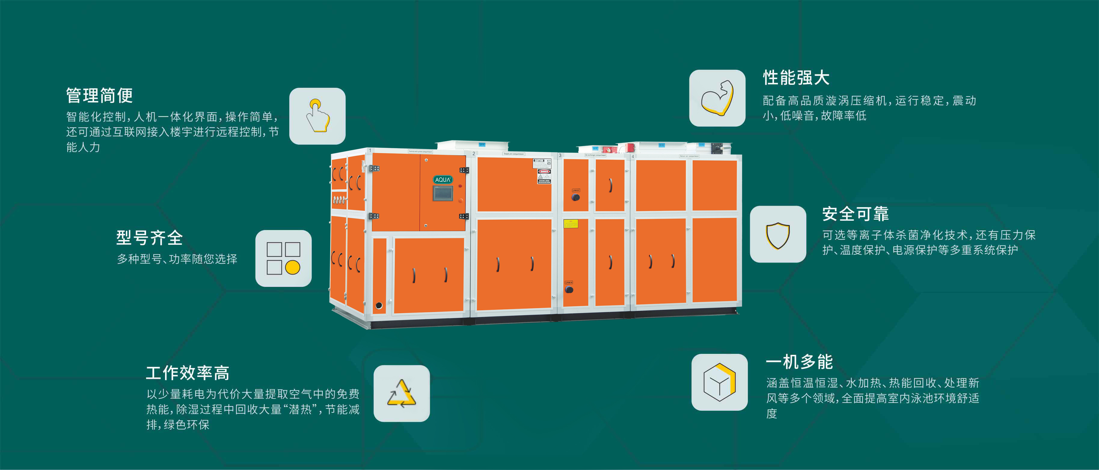 AQUA愛克恒溫除濕熱泵采??速精密可靠的?動(dòng)化電傳控制系統(tǒng),?機(jī)?體化界?,觸摸式晶彩液晶顯?屏,操作簡單,可以通過互聯(lián)?接?樓宇進(jìn)?遠(yuǎn)程控制,管理?便。