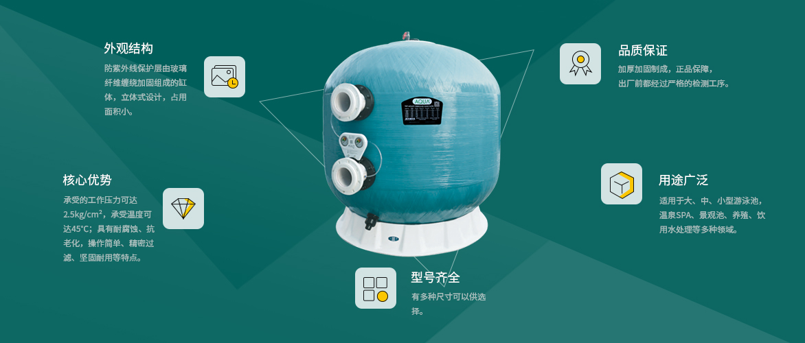 AQUA愛(ài)克泳池設(shè)備旗下過(guò)濾砂缸適用于任何濾料,有多種尺寸可供選擇。