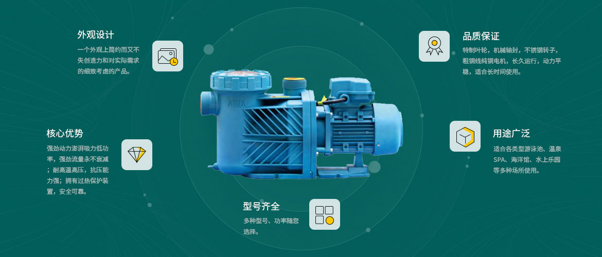 AQUA愛克泳池設備旗下的泳池循環(huán)水泵水泵適用于70℃的溫泉,承壓可達6kg/cm2,是適合各類型游泳池、溫泉SPA、海洋館等多種場所使用的水泵泳池設備。
