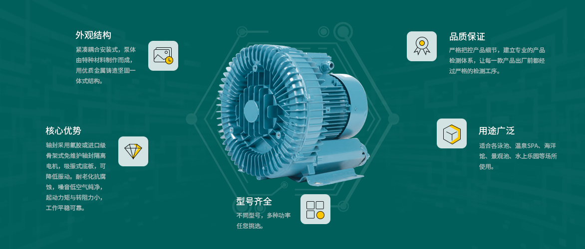 AAP系列風(fēng)泵嚴(yán)緊密封,可長(zhǎng)周期運(yùn)行,適合各類型泳池、溫泉SPA、桑拿洗浴等場(chǎng)所使用。