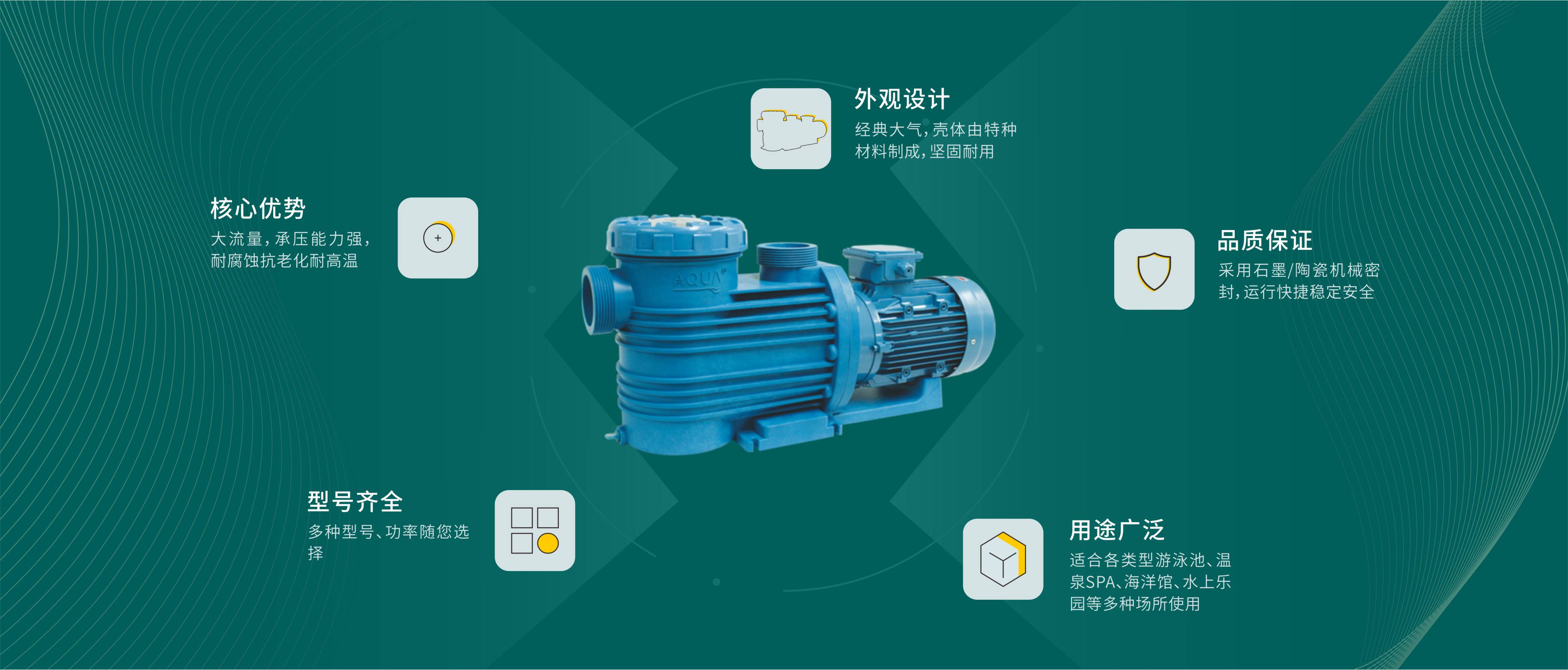 AQUA愛克泳池設(shè)備旗下的泳池循環(huán)水泵水泵適用于70℃的溫泉,承壓可達6kg/cm2,是適合各類型游泳池、溫泉SPA、海洋館等多種場所使用的水泵泳池設(shè)備。