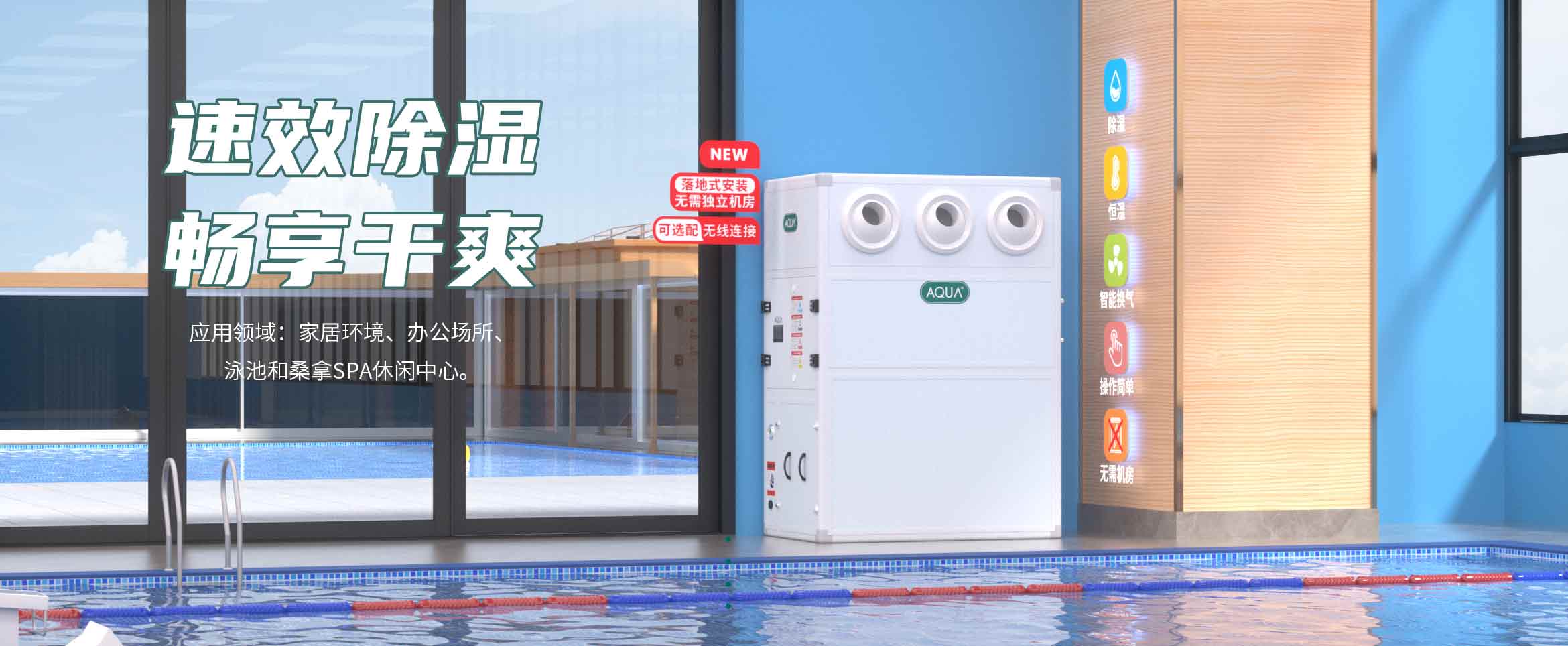 適用于SPA會所、室內(nèi)泳池、博物館、辦公室、檔案館、美術館、體育館、健身房、更衣室、儲藏室、無暖氣房間等需要除濕的室內(nèi)場所。