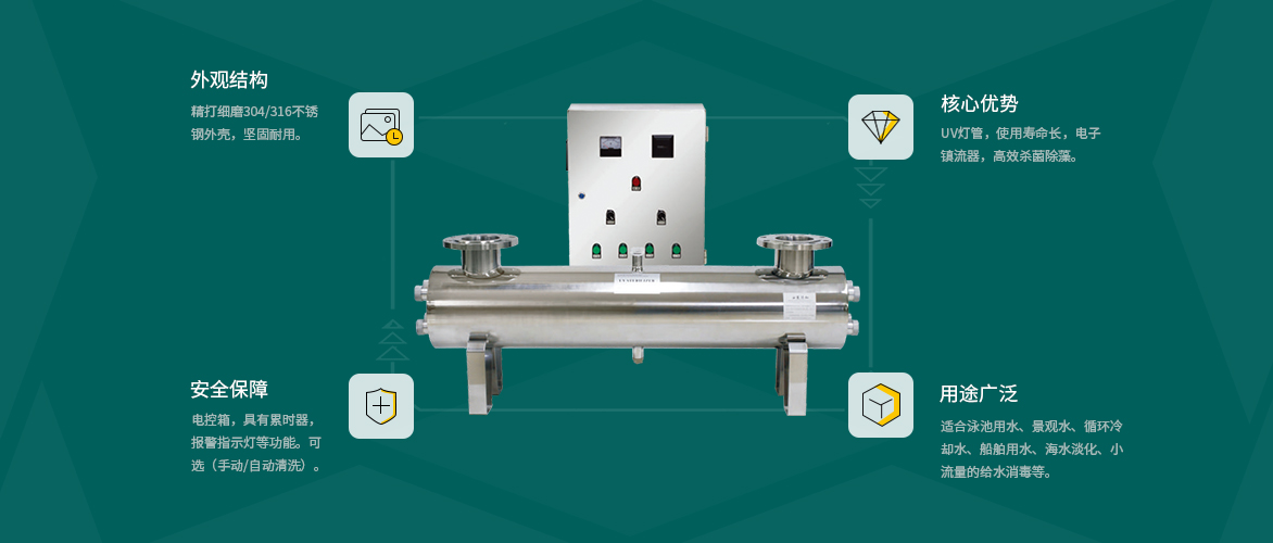 AQUA愛克泳池設備旗下紫外線殺菌器選用高透光率石英套管,效率高且耗能低,使用壽命長。
