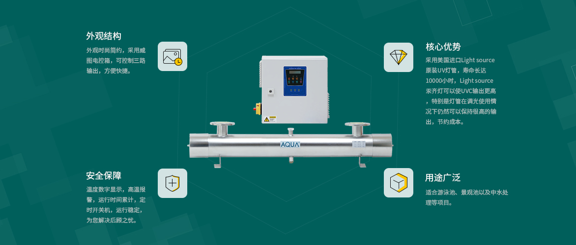 AQUA愛克泳池設備旗下紫外線殺菌器UVS系列配有智能控制電箱,有溫度顯示、高溫報警等多種功能。